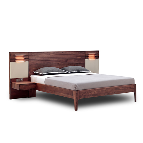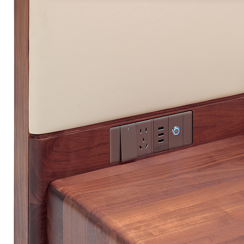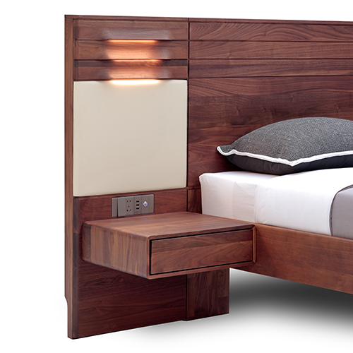 床头见光不见灯的巧妙设计、悬空的弹推式床屉设计、意大利小牛皮点缀的床头设计。